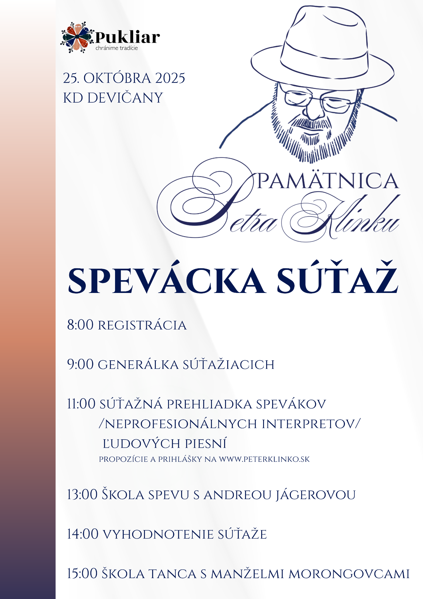 Podujatie je venované spomienke na Petra Klinku – človeka, ktorý celý svoj život zasvätil hudbe, folklóru a kultúre rodného kraja. Jeho odkaz sa stal inšpiráciou pre mnohých a jeho práca nám pripomína, že tradície sú mostom medzi minulosťou a budúcnosťou.